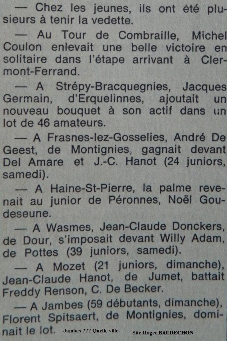 - Dans le « TOUR DE COMBRAILLE » (près de Montluçon) le coureur Michel COULON originaire de Jamioulx a gagné une étape. Il a été pro durant 6 années et a participé à quatre reprises au « TOUR DE FRANCE ». Chez les amateurs, il a même été 3e à Deux-Acren en 1967. Comme il a été premier chez les pros à Soignies en 1969. Il a 73 ans.