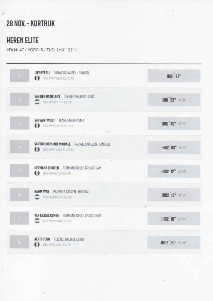 La course est partie très vite. Il faut bien avouer que le parcours était hyper roulant. Au moment où VANTHOURENHOUT est parti, nous pensions déjà qu’il pouvait s’imposer comme la semaine dernière. Mais c’était sans compter sur le trio en chasse. VAN AERT faisant un gros boulot pour reprendre le fuyard. Le petit gabarit d’ISERBYT a fait des merveilles dans les divers lacets qui servaient à ralentir et à allonger le circuit. C’est seul qu’il arrivera pour la victoire. VAN DER HAAR est encore présent !!! VAN AERT est 3e. Bonne sortie pour HERMANS et VAN KESSEL. Le second étant souvent à l’avant. AERTS T est un rien en retrait pour le moment. Pour SWEECK L, il faut de la boue, sa 9e place en témoigne. Voilà deux semaines que nous n’avons plus vu OGER dans les résultats.