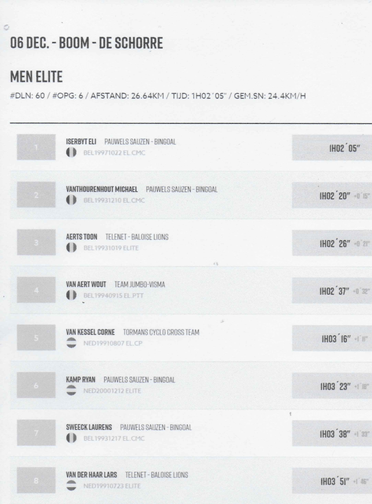 Le Domaine Provincial « DE SCHORRE » est superbe pour la pratique du cyclocross. Il n’en reste pas moins que pendant que les pros du vélo s’en donnaient à cœur joie, la population habituée des lieux n’avaient pas accès aux différentes attractions. Il n’empêche, la course des élites hommes fut emballante. Nous attendons peut-être trop de VAN AERT car il n’ a pas le rythme des autres qui sont dans le grand bain depuis des semaines. Félicitations à ISERBYT qui va être le petit gars de l’année !!!