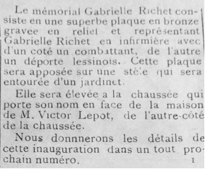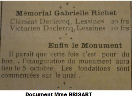 « La plaque dont vous parlez se trouve à l’ancien cimetière de Lessines, stèle de la tombe de notre héroïne, admirable patriote. La ville a reçu des subsides venus de Bruxelles, de l’école Moyenne d’Ath et bien entendu des écoles et des habitants de Lessines afin de pouvoir lui ériger monument mais semble-t-il au quai (article de journal ci-dessous).