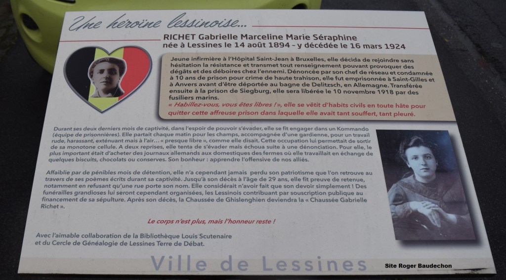 Vous avez été plusieurs à nous signaler que les pages relatives à la guerre de 14-18 rédigées par un site abonné étaient très intéressantes. (Somme-Bellefontaine.fr) Il est vrai que ce n’est pas du cyclisme mais les histoires relatées sont poignantes. De belles leçons de vie. Mais voilà, nous ne sommes absolument pas des spécialistes de la résistance et de l’Histoire de Lessines. Nous possédons juste quelques notions. Pour cela, il y avait feu Mr Raymond DUHAUT et ses membres du « CERCLE D’HISTOIRE DE LESSINES ». En ce moment, il y a « LE CERCLE DE GENEALOGIE DE LESSINES » avec Mr LEVEQUE, Marc et toute son équipe. Alors, pour éviter de nous emmêler les pinceaux, nous avons demandé de l’aide afin de mener l’enquête relative à la stèle de Mme Gabrielle RICHET. Cette résistante a une CHAUSSÉE à son nom dans le quartier de Saint-Roch. Lieu où les courses cyclistes du « CAYOTEU » se déroulent chaque année. De quoi nous souvenir. Nous tenons à remercier GRANDEMENT Mr Yves WICQUART et Mme France BRISART pour l’accord donné afin que ce texte puisse paraitre. L’enquête fut rapide. Ils avaient toute la documentation. Nous ne pouvons que vous inviter à vous abonner au « CERCLE DE GENEALOGIE » (site). Le coût est MINIMAL !!! Et vos perspectives sont immenses !!!