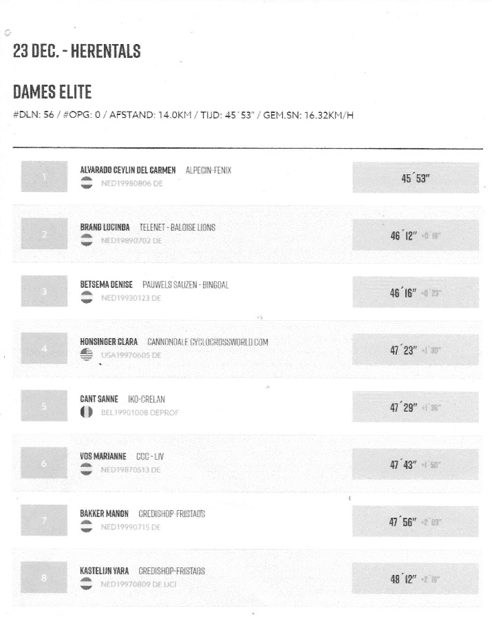 Très beau parcours que celui qui a été proposé par Erwin VERVEKEN le natif de … HERENTALS !!! Un peu plus boueux et technique que de coutume, il a été déterminant dans la lutte pour la première place. CANT fut du début, un peu moins à la fin. Les trois favorites restent hollandaises. Elles le sont d’ailleurs depuis le début de saison. Elles raflent tout !!! ALAVARDO gagne à la dure devant BRAND et BETSEMA. Les autres prétendantes sont à 1 min 30. L’américaine HONSINGER, véritable révélation 2020 est 4eme. CANT 5e. Et la vétéran VOS est 5eme. VAS, 9e n’avait pas la puissance pour un parcours aussi lourd. 14e, NORBERT-RIBEROLLE part toujours super bien mais peine à garder les roues. Avouons que les hollandaises ont vraiment mangé beaucoup de gouda !!!