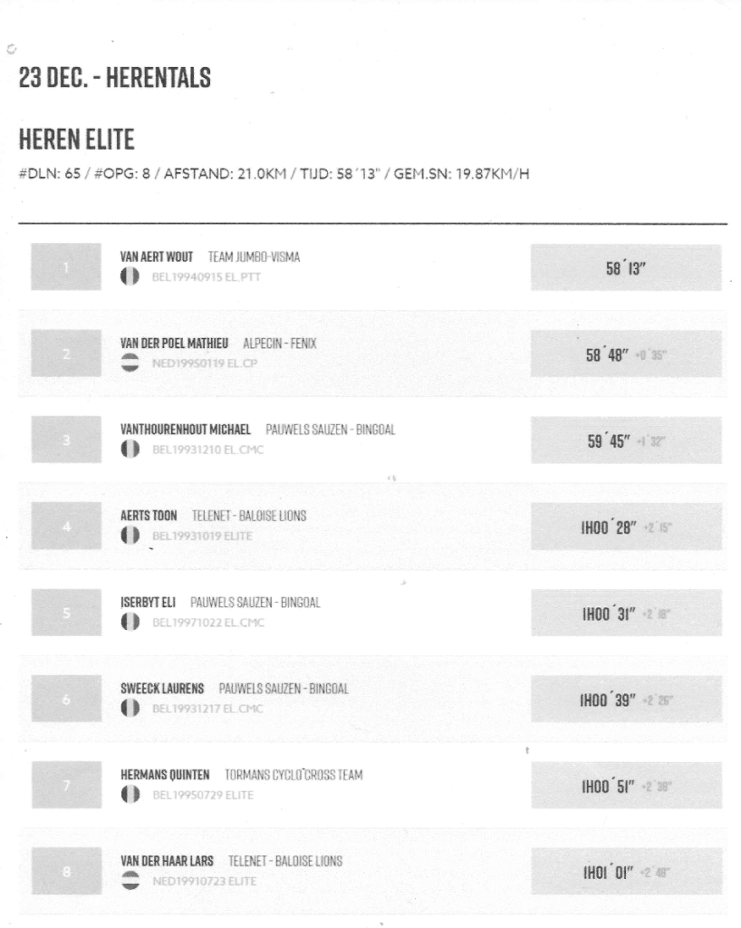 Sur des circuits de cette qualité, les coursiers ne peuvent prendre que du plaisir. Et ce même, s’il n’y a pas de spectateurs. Tout y est. Ceux d’entre vous qui ont roulé des cross savent de quoi nous parlons. C’est hyper top. Maintenant, quand VDP prend le devant comme il l’a fait, c’était le jeu de la roulette russe. Je gagne ou je perds. A-t-il été trop présomptueux ? Probablement. VAN AERT n’a jamais abdiqué. A l’arrière, AERTS, SWEECK, VANTHOURENHOUT, ISERBYT, HERMANS, … n’ont pu que limiter les dégâts. VAN AERT vainqueur, cela signifie qu’il est en condition. Et qu’à quelques semaines des mondiaux et du championnat de Belgique, il faudra le pointer dans les pronos !!! Avec PIDCOCK qui était absent !!!