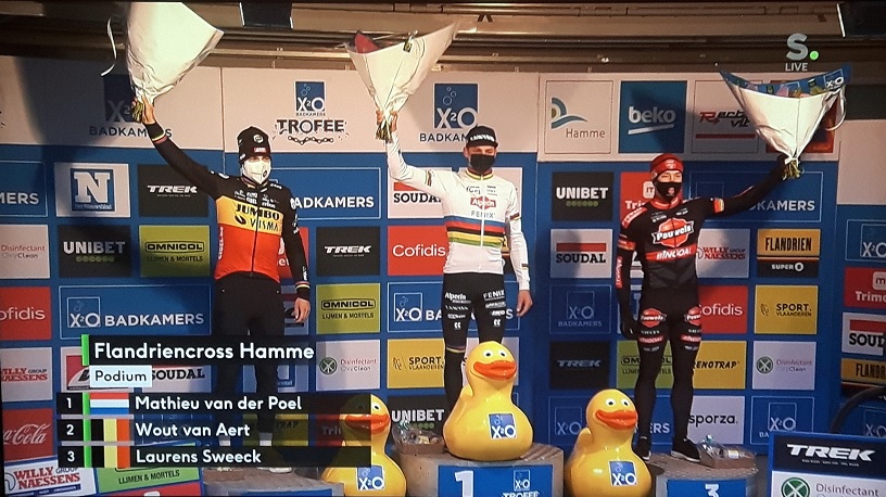 C’est sur un magnifique parcours que s’est tenue la manche du « H2O Trofée » à HAMME. Montées, descentes, un peu de course à pieds, du bois, juste ce qu’il faut de boue. Chez les hommes, le camarade Mathieu VANDERPOEL a une nouvelle fois montré toute sa suprématie dans les cross. Il a bien joué au chat et à la souris avec VAN AERT. Qui est tombé et qui a perdu du temps. SWEECK revit à la troisième place. ISERBYT peine à retrouver son état de grâce de début de saison tout comme VAN DE HAAR. PIDCOCK se réserve pour ne pas s’épuiser mais sera t-il capable d’endosser la tunique la semaine prochaine. Pour le moment, il est dans le coup. Chez les dames, ALVARADO reprend le pouvoir. Ses concurrentes ayant presque toutes subi les affres du circuit piégeux. Ce n’est pas le moment de prendre des risques. La plus belge des françaises, NORBERT-RIBEROLLE est 8e. Un bel encouragement calée qu’elle était dans un véritable peloton de « oranje ». CANT est en dents de scie, dans un bon jour, elle pourrait encore surprendre. Ce dimanche, « COUPE DU MONDE UCI » !!! Celles et ceux qui ont roulé les deux jours auront-ils encore de l’influx ?