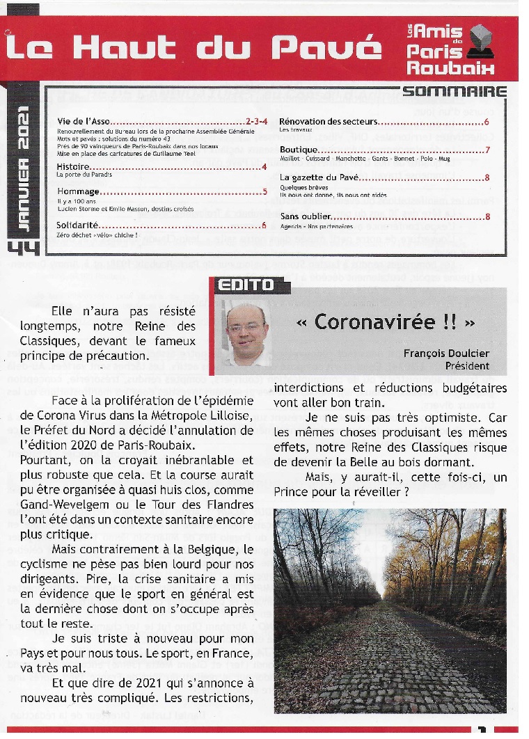 Quand vous voyez une grande enveloppe affranchie avec de beaux timbres bleus de la République Française, pas de doute, il y a quelque chose d’intéressant à l’intérieur. Non pas un voyage remporté lors d’un concours. Mais si en plus, elle est à l’effigie des roubaisiens, vous avez tout de suite compris. Voilà, tout est là : la carte avec les bons vœux, le rappel de l’annulation de l’édition 2020 de P-R, un document pour proposer votre candidature dans le comité, un autre pour acquérir des accessoires estampillés « P-R » (maillot, cuissard, t-s, … ), les hommages (à DEMAN, STORME, E MASSON) et les travaux entrepris dans les tronçons endommagés. Enfin, une date. Le 11 avril 2021 pour assister à la grande classique du ch’ti Nord !!! Si vous souhaitez en savoir plus, n’hésitez pas à aller sur leur site et même de vous abonner !!! #Top