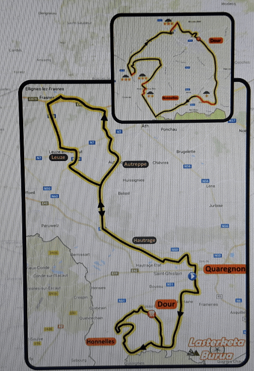 Départ des dames de la Place de Quaregnon à 12h20. Arrivée à Dour vers 14h40. 92,5 km. Départ des hommes de la Place à 12h30 mais les deux pelotons sont séparés d’une bonne distance. Arrivée à Dour vers 17h10. 205,4 km.
