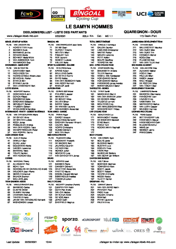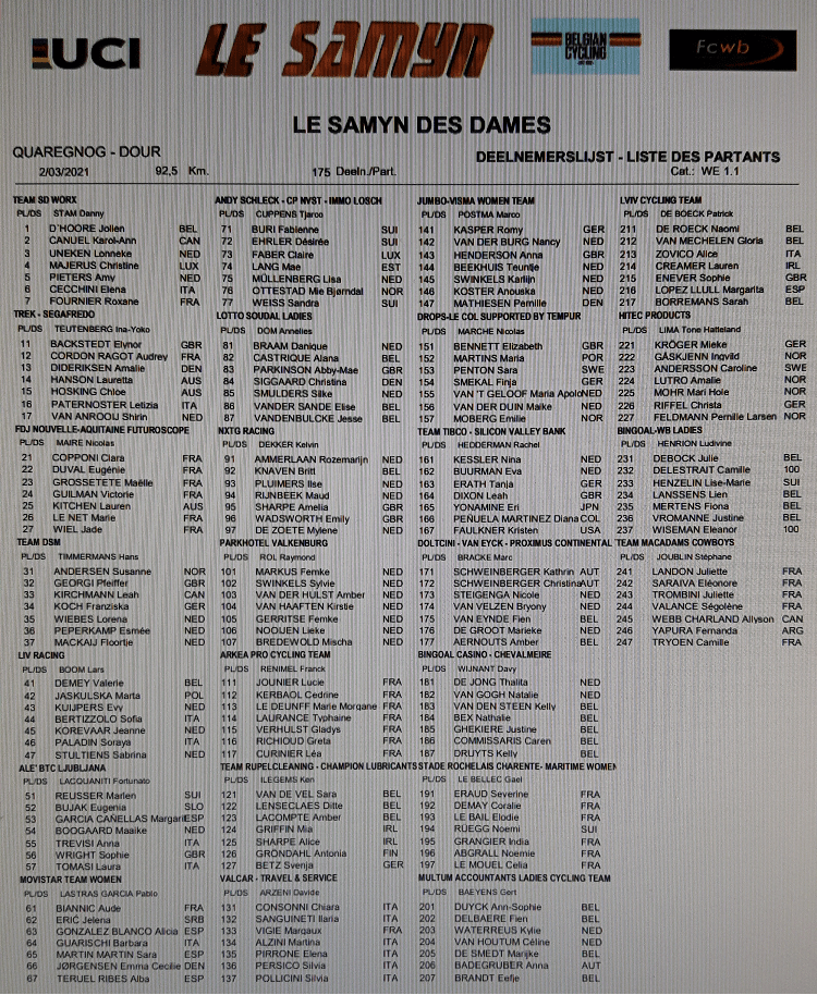 A peine un très long weekend se termine que déjà, le « GP SAMYN » va mettre les coureurs devant un nouveau challenge. Première épreuve wallonne qui est très attendue. RonaldC nous a transmis quelques messages qui précisent que tout prenait forme dans de bonnes conditions mais que les règles appliquées pour lutter contre la maladie seront appliquées. Pas de départ, pas d’arrivée, port du masque obligatoire, tests préalables pour ceux qui entrent dans l’organisation d’une manière générale. L’UCI, les Bourgmestres, la Police, le Gouverneur, … ne vont pas transiger avec les règlements. Souhaitons que ce ne soit pas comme sur le dernier « K-B-K ». Avez-vous vu ce monde le long des routes ???? Dingue. Alors que l’organisateur avait demandé de rester chez soi. Mais que le public en ait marre, est (très) compréhensible. De là à tout lâcher … il ne faudrait pas.