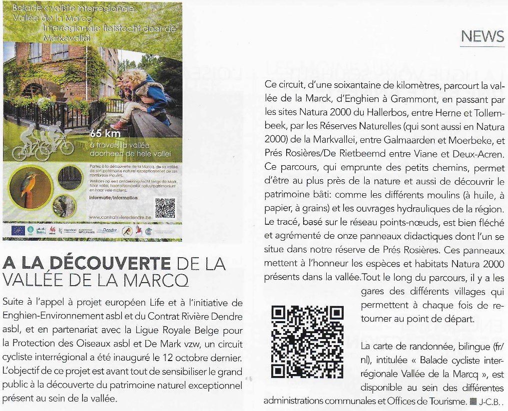Dans la dernière brochure trimestrielle de « L’HOMME ET L’OISEAUX » qui est magnifiquement documentée. Un rédacteur nous propose une bien belle balade dont nous insérons les informations utiles ci-dessous. Il est possible d’entamer le parcours sans trop de déplacement. Autant pour les « LOISIRS » que pour les « CYCLOS ». Par ailleurs, pour une somme modeste, vous pouvez adhérer à la « LIGUE ROYALE BELGE POUR LA PROTECTION DES OISEAUX ». Faune et flore. (gîtes, stages enfants, matériels, avantages, … ) Nous ne pouvons que vous conseiller ces ouvrages très intéressants. A vos circuits !!!