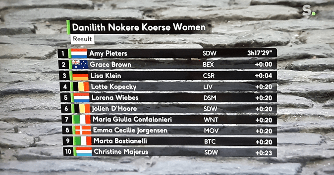 Les dames nous donnent toujours une compétition de premier ordre. Mais globalement, nous pouvons dire que les élites sont supérieures aux autres. Nous l’avons encore vu aujourd’hui sur les routes de NOKERE. PIETERS avait la forme pour elle !!! KOPECKI est 4e.