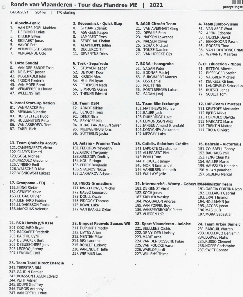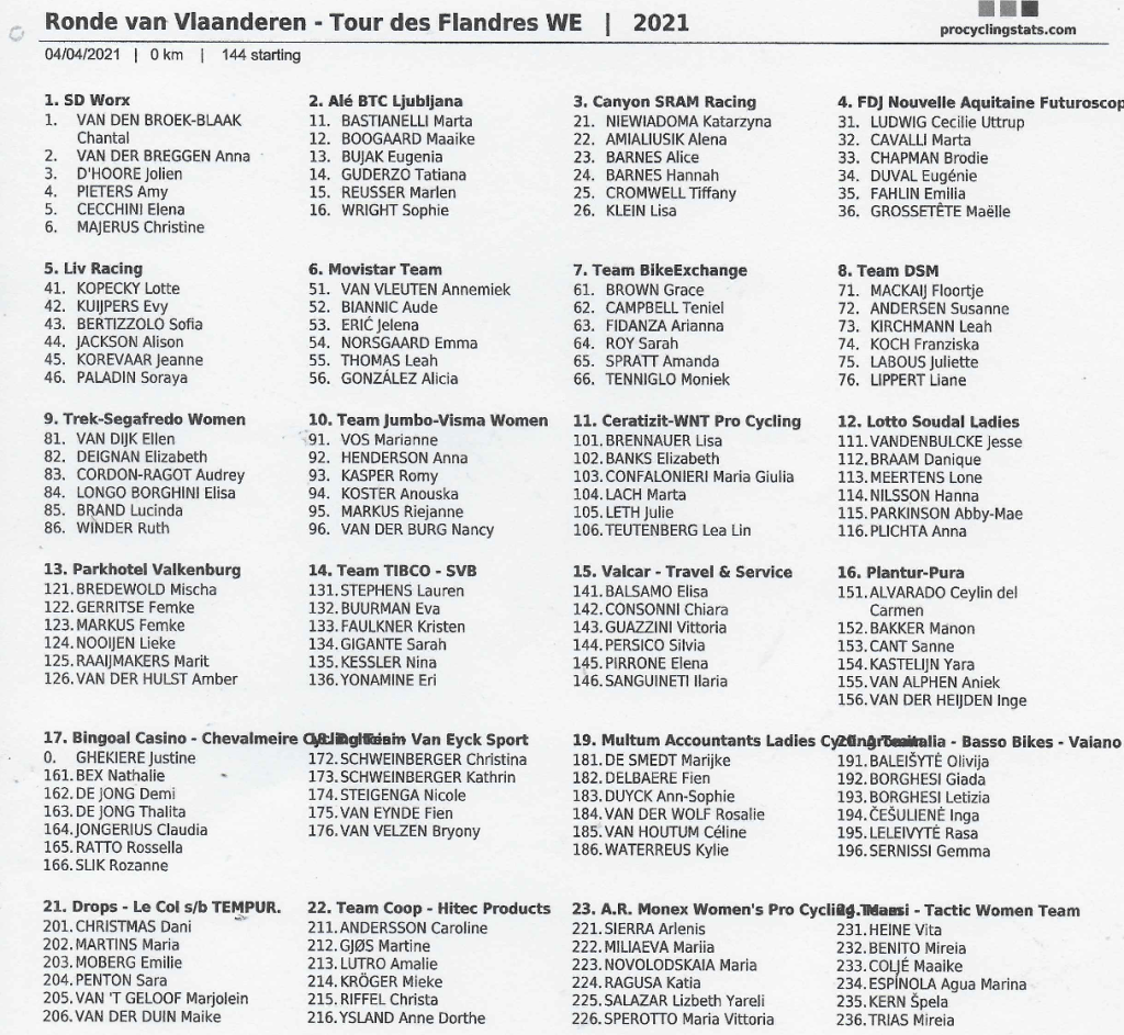Difficile de dire qui pourrait l’emporter. ALAPHILIPPE, VAN AERT et VAN DER POEL seront là mais il y a une bonne dizaine de prétendants dans leur sillage. Ceux qui savent encore gagner après 250 bornes sont assez rares. Chez les dames, les hollandaises vont encore une fois de plus nous en mettre plein la vue.