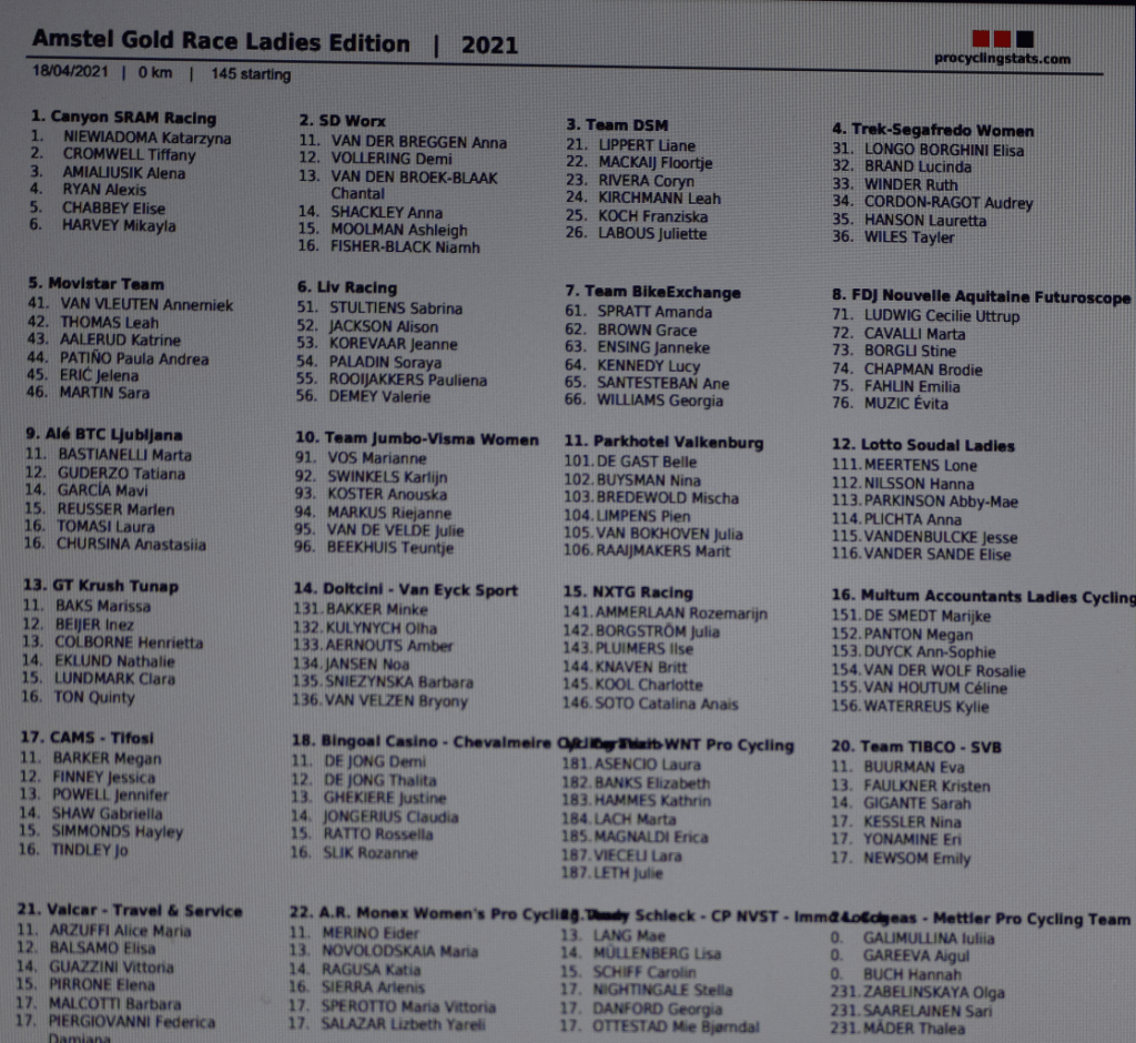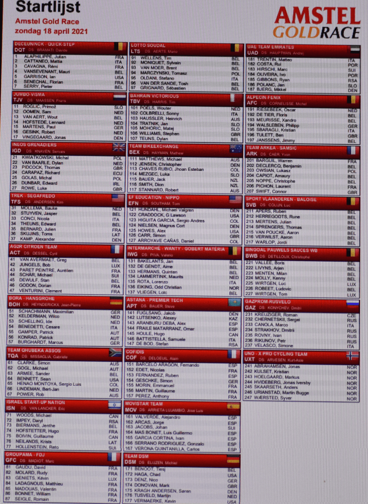 Pour nous lessinois, il y aura toujours une édition marquée par le « Prix de la Combativité » remporté par Thomas DEGAND qui avait fait partie de la très longue échappée du jour. Mais aussi par ce monstre de Philippe GILBERT qui humait l’odeur du houblon amstellodamois à peine arrivé sur le circuit. Quel champion !!! Mais voilà, depuis le début de saison « phil » semble avoir pris un coup de vieux. Sans nous tromper de beaucoup, il ne faudra pas omettre de cocher ALAPHILIPPE, PIDCOCK, STUYVEN, VAN AVERMAET, GAUDU, TEUNS, VAN AERT, FUGLSANG, TRENTIN, HIRSCHI, GESBERT, COSNEFROY … .Voici quelques informations pour suivre la course de ce dimanche.