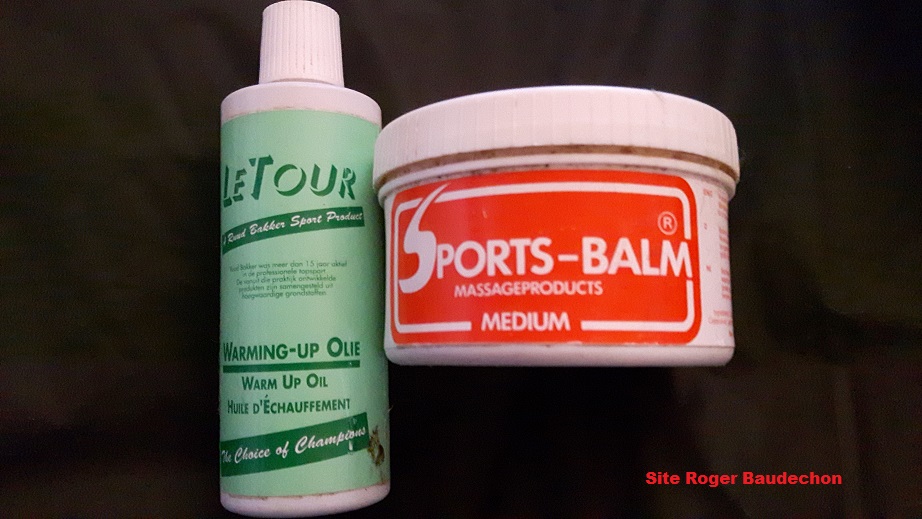 Avant une course, le compétiteur avait tendance (c’est toujours le cas) à se masser avec une graisse chauffante (pot de droite-orangée) afin d’aider ses muscles à faire face au froid ou à des démarrages instantanés dès le départ. Par ailleurs, il y a certains d’entre eux qui préféraient l’huile car elle était à la fois chauffante mais en plus, elle permettait à la pluie de ne faire que passer sur les jambes. Ces deux marques étaient fortement utilisées dans les années 1970-1980. Vous n’avez que l’image mais nous pouvons vous confirmer que l’odeur est toujours bien celle de nos folles années. Une senteur reconnaissable entre mille. Ce n’était pas de l’embrocation ou du camphre mais bien un produit plus évolué. D’autres marques existaient en parallèle.