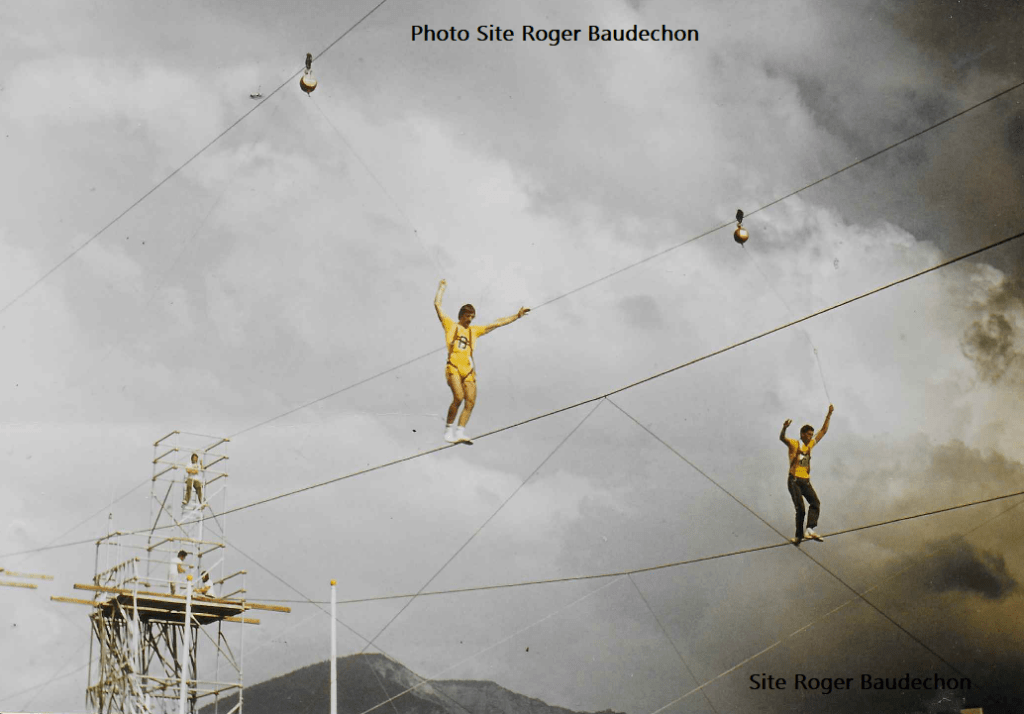 Le « canari » jaune que vous voyez sur son fil est Denis PETTIAUX. Pour le jeu du « funambule » à ANNECY, nous devions avoir un professionnel – pour éviter les risques. Je pense que c’est Jean-Pierre DUJARDIN ou Arsène LABLIAU qui avait été le chercher à l’école de cirque athoise. Il nous a suivis en France mais je ne pense pas qu’il était encore avec l’équipe en Yougoslavie. A ANNECY, il y avait des répétitions deux jours auparavant le jour « j ». Denis marchait sur ce truc comme s’il volait. Nous avions vite compris. Le jour des JEUX, (dans le stade de foot/athlé) c’était la foule et la folie. Quand son tour est arrivé, il a presque fait la traversée à la course sur son fil. Et il a gagné son épreuve. Le temps aussi comptait. Sur cette image vous le voyez au premier plan. C’était bien haut !!! Nous avons encore notre dossard « B ». Il devait tenir le câble de la poulie située à ses côtés. Plusieurs sont tombés mais le fil ralentisseur empêchait de s’écraser au sol. A l’arrière plan, vous avec le Lac et la montagne. Et dans les gradins surpeuplés, vous aviez Guy LEERENS, Jean-Marc BOUCHONVILLE, Roger LOSTERMAN, Jean SPITAELS, Ernest LEERENS, Je pense Jean DELHAYE, peut-être même Alex VANDENBERG, … et Francis LIVIS. (+ d’autres) Les nombreux supporters avaient fait le déplacement en voiture. Quand Denis a gagné, Hindrick, Luc, Marc, Martine, … ont fait de même. En ce y compris votre serviteur qui s’y est repris deux fois car le « carrousel » était tombé en panne … je suis donc passé en fin de programme. (stress) Le moment le plus prenant a été le départ de Jean-Pierre DUJARDIN, notre capitaine. Son papa ou sa maman (?) venait de décédé en Belgique et il devait nous quitter pour rejoindre sa famille. Ce fut un coup dur pour nous tous. Peut-être même est-ce pour cela que nos forces ont été décuplées et que nous avons remporté la bataille !!! Direction la finale à Belgrade car au plus grand nombre de points nous passions devant Charleroi qui était en pôle à cet instant. Notez que Denis PETTIAUX est ensuite devenu Juge Arbitre pour les « Jeux Sans Frontières ». Il a gardé le poste durant plus de dix saisons (1990-1999). Un bel avenir télévisuel !!!
