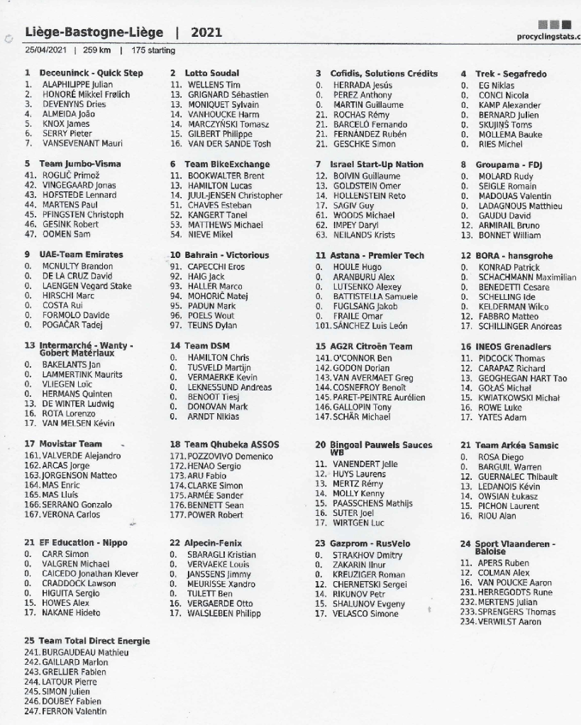LIEGE … même à la bataille des Ardennes n’avait jamais reculé (quoique, il y a eu des éditions annulées depuis 1892 – surtout durant les grandes guerres). Et bien en 2021, ce sera encore le cas. Et si dans les années 1940 les habitants ne sont pas sortis pendant que l’armée de PATTON tentait de repousser l’envahisseur, ce sera aussi la norme cette année. L’ennemi invisible est là et les habitants sont invités à rester chez eux. Trêve de bavardages. « L-B-L » va nous réserver des surprises. Une dure pour les durs à cuire. Toutefois, le temps sera trop beau pour créer des disparités importantes. Le vent peut-être ? Comme ce « blaireau » d’HINAULT se traçant un trajet entre les flocons ou encore ce « cannibale » de MERCKX qui aurait mangé le tarmacadam pour aller plus vite. Ou notre cher Claudy CRIQUIELION qui en avait toujours un ou deux dans sa roue pour lui faire échec. N’évoquons plus 1987 !!! LIEGE n’est pas le RONDE pourtant, une concurrence existe entre elles. Comme tout l’est en Belgique !!! Et bien, notre prono pour dimanche c’est ALAPHILIPPE. Il a retrouvé de sa superbe et de la motivation. Mais attention aux « EMIRATES » qui n’ont pu mettre les roues sur la « FLECHE » !!! Ils auront un esprit revanchard. Et ROGLIC. Il a perdu une fois. Fera-t-il la même erreur dimanche ? Citons enfin VALVERDE qui est sur la fin et qui le sait. Il ne terminera pas sa carrière sans laisser une nouvelle fois son nom au palmarès d’une prestigieuse.