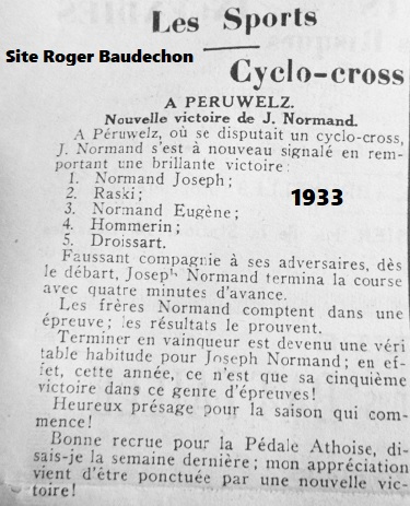 Par cet article, vous avez là les frères NORMAND. Joseph a gagné à six reprises dont à WIERS, GRANDGLISE, PERUWELZ, … . Avec Eugène, ils formaient la paire dans les labourés. Vous constaterez qu’ils prennent deux places sur le podium de l’épreuve qui s’étaient déroulée à Peruwelz. Ils avaient été recrutés pour faire partie de « LA PEDALE ATHOISE ». Ils ne faisaient pas partie de ce team en 1932. Et le 05 mars 1933, ils participeront au CHAMPIONNAT DE BELGIQUE de la discipline. Toutes les catégories seront d’ailleurs représentées : professionnels, indépendants, juniors, débutants dans une seule épreuve. Par ailleurs, dans un autre article, on apprend que LELEUX, CORDIER, WATTIEZ, LEROISSE et Emile BRUNEAU défendront les mêmes couleurs. En outre, Omer THYS emmènera la troupe avec MALBRECQ et DAGRAIN. Un fameux contingent !!! Tous étaient à la fois présents en cyclocross, sur les vélodromes et sur route durant l’année. « PLACIDE », le journaliste enthousiaste, se demande même s’ils seront capables de détrôner Jef DEMUYSERE (Wervik) qui l’avait emporté en 1932 à Tervuren !!! « Les paris sont ouverts » dit-il !!!