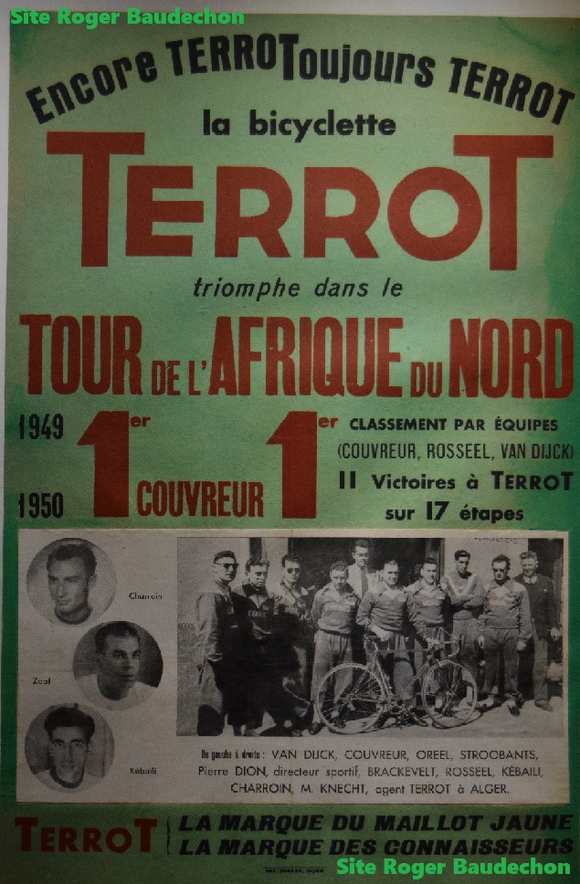 La marque « TERROT » a sponsorisé une équipe cycliste durant des saisons. Vous pouvez en retrouver plusieurs posts sur ce site. Néanmoins, voici une autre affiche qui mettra en lumière que bien que française, elle participait déjà à des épreuves internationales et n’avait pas peur de se déplacer sur d’autres continents. Il s’agissait déjà d’équipes composées de plusieurs nationalités. Cette forme de structure ne date donc pas des années 1970 comme nous l’avions souvent imaginé. Les marques de cycles sont toujours très impliquées dans le milieu professionnel … et quelques fois amateur.