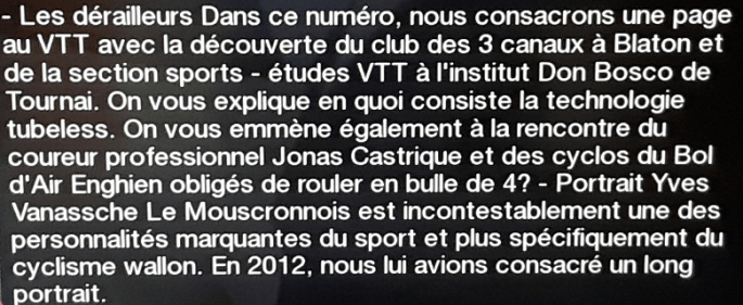 Le nouveau reportage de « NOTELE » traitant de cyclisme vient de sortir. « LES DERAILLEURS » est disponible. Il est toujours possible de le voir ou de le revoir soit sur la chaîne, soit sur Internet. (direct) L’émission repasse en ce moment, à 13h30, demain à 15h15, … . Voici l’alléchant programme :