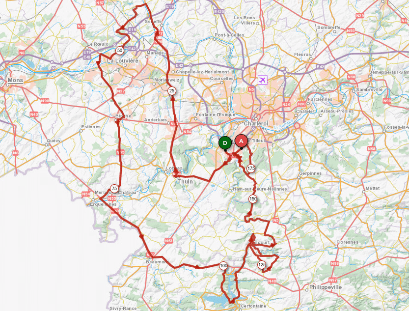 Un circuit qui arpente à quelques encablures de Lessines puisque Le Roeulx et Seneffe ne sont qu’à une trentaine de minutes. Beaux paysages dont les lacs de l’Eau d’Heure. Premier tronçon > 160 km. Ensuite, trois circuits locaux de 10,8 km.