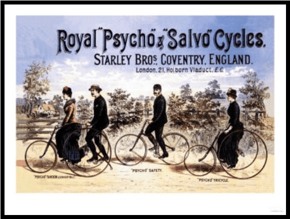 En cette période tellement anxiogène pour les citoyens, ces cycles viennent bien à-propos. « ROYAL PSYCHO ET SALVO CYCLES ». Avouez qu’avec un nom pareil, les psychologues-psychiatres devraient orienter leur patientèle vers le vélo !!! Non ? La marque en question a existé dès 1886 avec des tricycles. Mais c’est en 1888 que le premier deux roues est né. Comme vous pouvez le constater sur ce folder, la bicyclette était aussi bien vendue à Londres qu’à Paris. Elle est souvent associée à la firme « STARLEY BROS ». Nous voguons dans l’âge d’or du vélo. Il y avait des entreprises absolument partout en Europe. (Diverses sources)