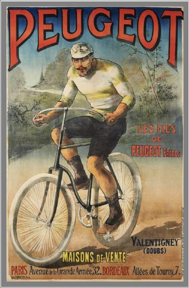 Retraçons brièvement l’historique de la firme « PEUGEOT ». Elle a énormément évolué avec le temps. Elle s’est sectorisée. « PEUGEOT » est une entreprise née en 1810 – aciérie. C’est vers 1882 qu’elle se lance dans la fabrication du « Grand-Bi » et du « Tricycle » avec Armand. Elle passe au vélo classique en 1886. Elle déménage de l’usine de Montbéliard à celle de Beaulieu. Les effectifs sont de plus en plus conséquents. Elle y restera jusqu’en 1970. La robustesse sera sa qualité première. Elle produit des sous-marques comme « GRIFFON » et « AIGLON ». Mais, comme d’autres, elle a senti que la compétition allait devenir un marché très porteur. En 1930, elle s’associe à « AUMOTO » et « TERROT » … puis les absorbe. En 1972, elle déménage à nouveau vers Romilly-Sur-Seine. Jusqu’en 1980, elle restera une des grandes marques françaises comme : « MOTOBECANE », « GITANE », « MERCIER », … . En 1982, elle s’associe avec « GITANE » et cède la licence « PEUGEOT » au groupe « BH » qui constitue la société « CYCLEUROPE ». « PEUGEOT » reprend la licence en 2004. C’est toujours « CYCLEUROPE » qui fabrique les vélos à ce jour. Il y avait 500 modèles au siècle dernier, il en reste à peine une vingtaine. « PEUGEOT » c’est aussi la société de production de chaines « SEDIS ». Dans le montage, ils ont utilisé au maximum les composants français tels que : « STRONGLIGHT », « MAVIC », « SIMPLEX », … . Dans le sport cycliste, d’abord BOURILLON et AUCOUTURIER roulent et gagnent sur leurs vélos. Ensuite, TROUSSELIER (affiche) remporte le TOUR. POTTIER, PETIT-BRETON, LAMBOT, THYS, THEVENET allongent la liste. Le maillot et le cadre à damier apparaissent en 1963. Le noir et le blanc était une astuce pour une meilleure visibilité en TV. Elle restera dans le cyclisme professionnel jusqu’en 1989. Puis comme sponsor de « FESTINA » jusqu’en 1999. N’omettons pas que « PEUGEOT » ce n’est pas que le deux-roues. Le constructeur est présent dans l’automobile et la motocyclette.