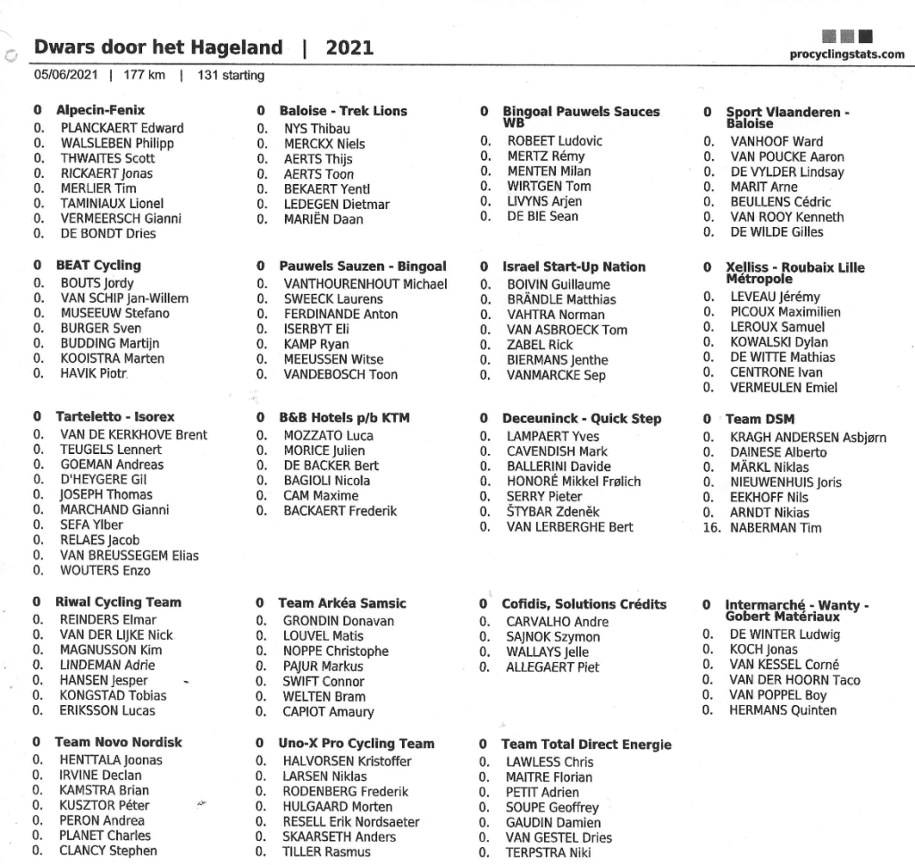 Le « HAGELAND » est une réserve naturelle vallonnée se trouvant en grande partie dans le Brabant Flamand et en minorité dans le Limbourg. Vous voilà informés géographiquement. Il y aura +/- 130 partants parmi lesquels nous retrouvons des pointures mais également des régionaux comme PICOUX, ROBEET, DE WINTER, TEUGELS, TAMINIAUX, MARIT, BACKAERT, … . 177 km au terme desquels, il faudra venir à bout des « DECEUNINCK » et des « ALPECIN ». Une manche de la « BINGOAL CYCLING CUP ».