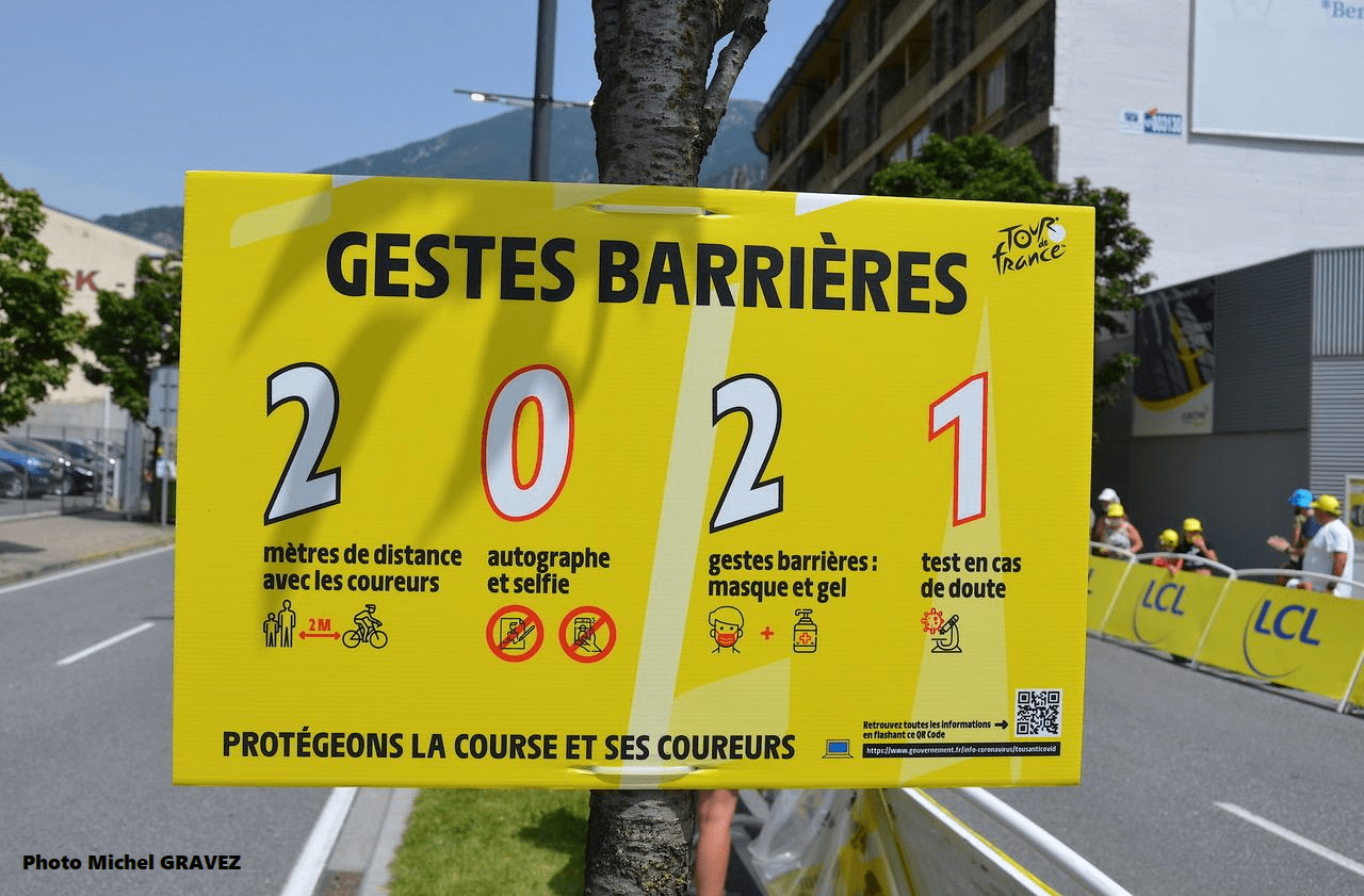 La société « ASO » avait prévenu dès le départ que des conditions strictes seraient d’application. D’ailleurs, des panneaux fleurissent un peu partout. Un rappel afin de pouvoir accéder à certaines zones. Pourtant, à la vue des images télévisées, il apparait évident que ce n’est pas souvent le cas. Il est clair que les vaccinés et les enfants sont moins dangereux. Mais les autres ???? Et quand vous voyez comment certains spectateurs s’époumonent en criant dans le visage des coureurs … c’est à se demander comment il n’y a pas de cas positifs dans le peloton. Il n’en reste pas moins que les curseurs remontent partout en Europe. Finalement, cela n’a rien d’étonnant. Les déplacements sont de plus en plus importants. Quant au TOUR, il est itinérant et rencontre, par la force des choses, des populations diverses. Merci à MichelG pour l’envoi de ce cliché.