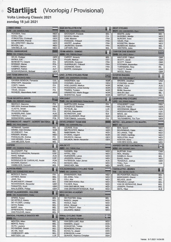 Dimanche 18 juillet, la « VOLTA LIMBURG CLASSIC » partira de EIJSDEN dans la banlieue de MAASTRICHT. Pour les messieurs, 195 km au programme. Et du lourd avec un nombre impressionnant de côtes semblables à celles de l’AMSTEL. Pour les dames, ce sera 101,3 km. Cette épreuve fait partie du challenge : « LIMBURG CYCLING CLASSIC ». Dans la foulée, il y aura encore le « HEL VAN VOERENDAAL » (01/08), le « TON DOLMANS TROFEE » (22/08), le « EUROPE OMLOOP » (12/09) et le « RONDE VAN LIMBURG » (10/10) SI rien ne change d’ici là car vous savez que les Pays-Bas font marche arrière en matière de pandémie.