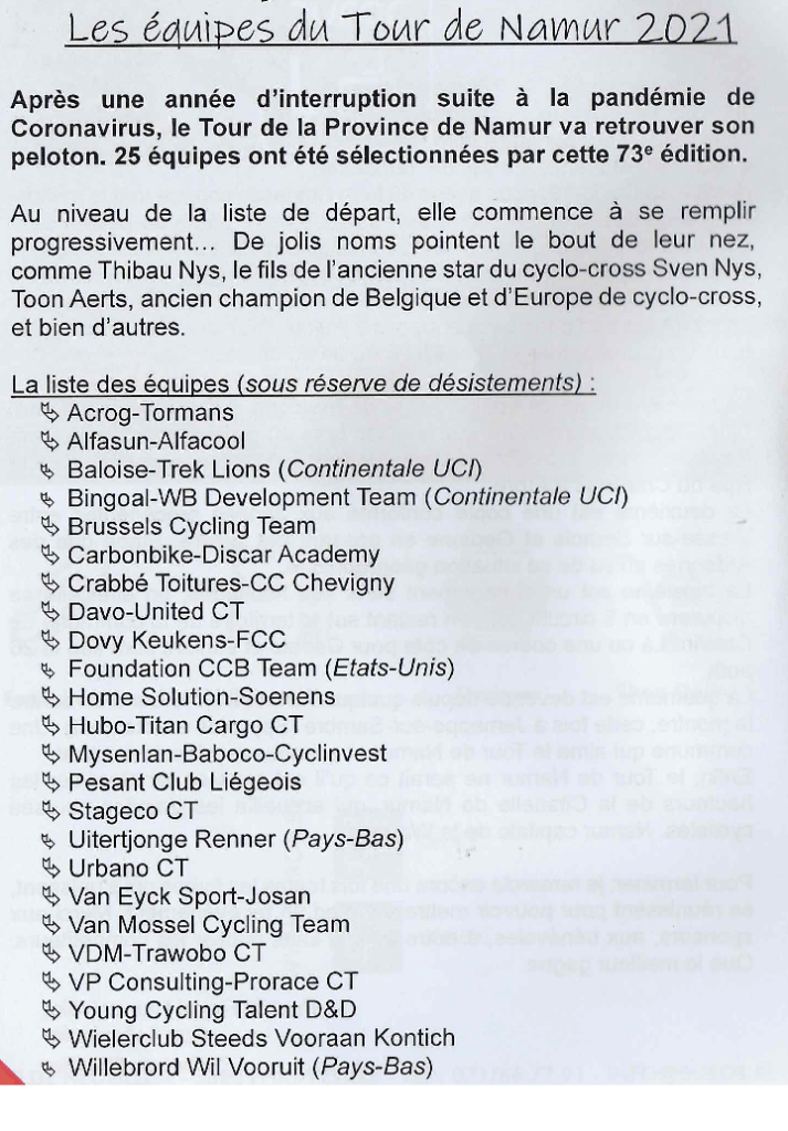 Voici ce que GUILLAUME Arnaud (secrétaire) en dit dans le dernier « LA SPORTICYCLOMANIE », la revue du « Royal Namur Vélo » que nous avons reçu à domicile. Il n’en a pas dit autre chose, téléphoniquement, mercredi dernier. Tout se met en place. #Encouragements