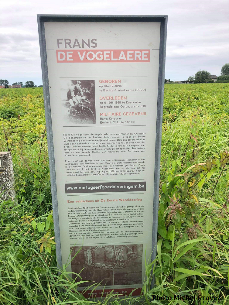 Dans l’arrière-pays de La Panne, direction Diksmude, les Polders sont très naturels. Près de la Tour de l’Yser, il y en encore des boyaux de la mort reconstitués (guerre de 14-18). MichelG a fait une randonnée qui l’a conduit à ALVERINGEM (aux abords de Furnes) Et au détour de ces chemins très pittoresques, un panneau qui nous remémore l’ancien cycliste Frans DE VOGELAERE. Nous préparons un « SOUVENEZ-VOUS » le concernant. #Curiosité