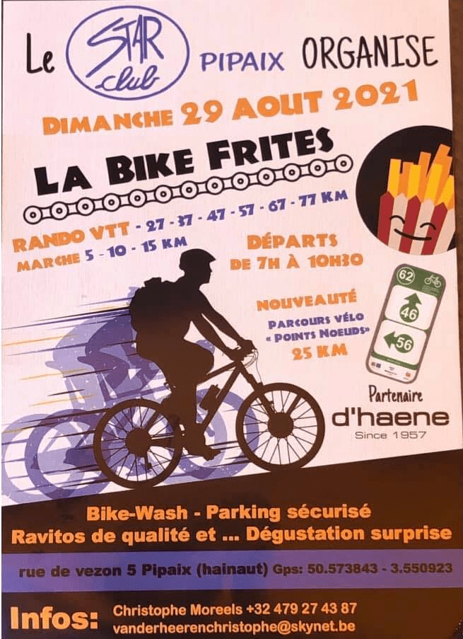 Ce dimanche, les pilotes du « VTT TEAM LESSINES » étaient une petite dizaine à prendre la direction de PIPAIX pour la « BIKE FRITES » (et oui !!!) Distance : 37-47-57-67 et 77 km. Une organisation du « STAR CLUB PIPAIX » (proche de Leuze-en-Hainaut). Nous aurions pu penser que la boue serait omniprésente. Manifestement, ce n’était pas le cas. Des informations communiquées, le vtt a été agréable.