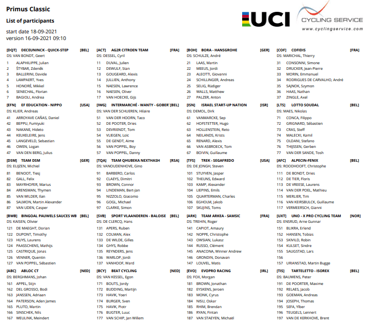 Encore une « belle » aux portes de notre entité !!! En effet, la « PRIMUS CLASSIC » (« IMPANIS/VAN PETEGEM KOERS ») aura pour lieu emblématique la Place de BRAKEL. Signature des coureurs sur le podium dès 11h30. Départ à 12h45. Arrivée à BOORTMEERBEEK vers 17h30. Un peloton conséquent est inscrit comme de coutume.