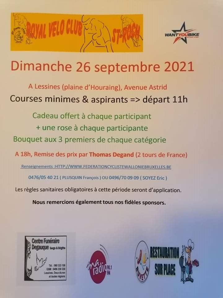 Durant les deux prochains jours, nous vous présenterons la journée qui se déroulera ce dimanche à Houraing (Lessines). En effet, si des posts ont déjà été rédigés sur le sujet, il est maintenant temps de vous donner d’autres perspectives. Ainsi demain (jeudi), vous aurez une vue du circuit en quelques images. Et vendredi, le programme de la journée sera en ligne. En fait de la – demi-journée – mais elle sera très complète de +/- 12h00 à 17h00. Des jeunes régionaux seront dans les pelotons. Veillez bien aux horaires !!!
