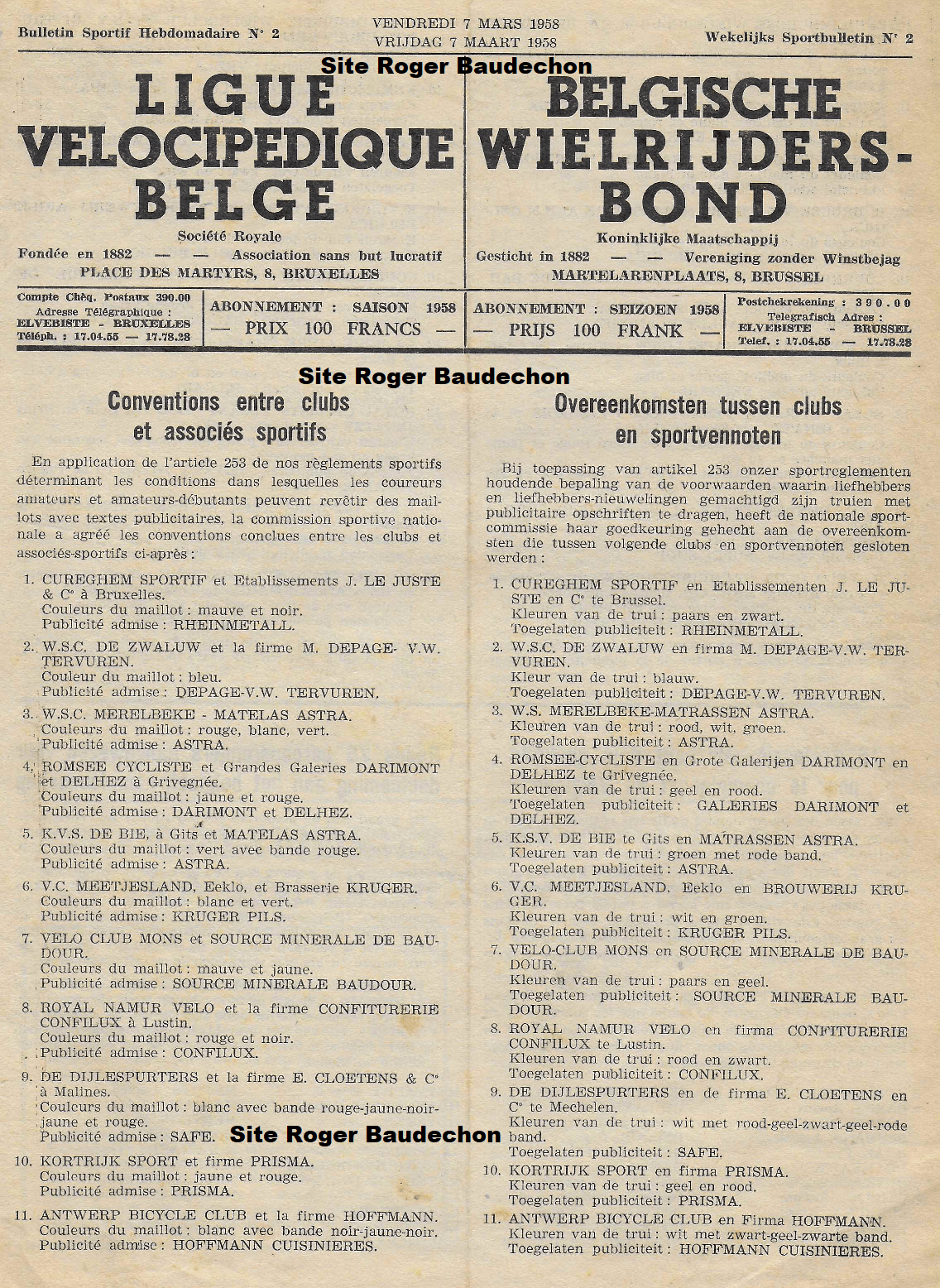 Une « CYCLOSPRINT » de 1958. En réalité le terme est apparu bien plus tard. Cette année-là, c’était encore « LIGUE VELOCIPEDIQUE BELGE ». C’est dans cet outil, à l’heure où l’informatique n’existait pas encore, que la fédération officielle de cyclisme informait ses membres, ses clubs, ses coureurs, ses annonceurs, … . Ainsi dans celui qui est présenté en entête, elle publie les conventions conclues avec les clubs. Une page intérieure donne déjà une partie des présélectionnés pour les « CHAMPIONNATS DE BELGIQUE » des professionnels. Le livret énumérait les sélections pour les « CHAMPIONNATS DU MONDE ». En outre, les retenus recevaient un courrier de la Ligue. Une autre partie concernait le « KALENDER DER WEDSTRIJDEN ». En effet, il était rédigé dans les deux langues (Fr/Nl). Chacun sa moitié. Une autre page donne les gains qui seront remportés par les coureurs sur les différentes épreuves nationales. C’était sommaire mais complet. Il a changé de format et de présentation à plusieurs reprises. Il est devenu plus luxueux. Et il a contenu des reportages et des entretiens. Il semble encore disponible sur le net. Auparavant, il pouvait aussi être retiré en librairie. Nous avons encore quelques exemplaires de cette époque (archives de notre père). Il est même possible que Mr HAVELANGE puisse encore vous en fournir. Il détenait/détient toutes les années.