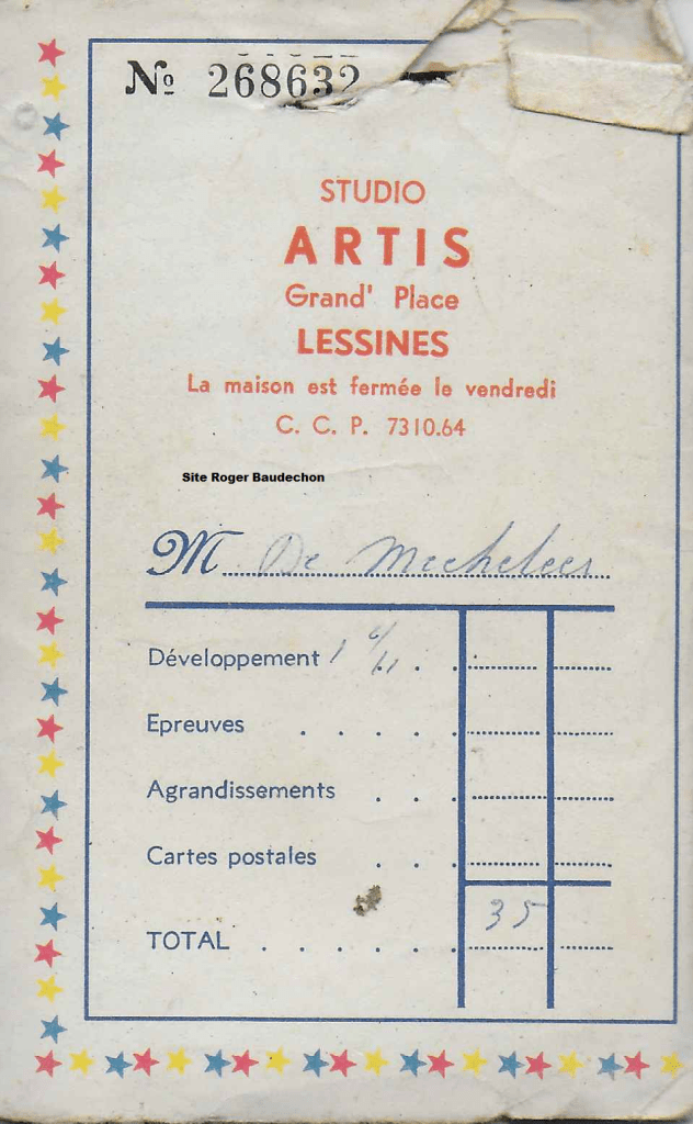 Photo. Le photographe « ARTIS » – Lessines – développait énormément dans les années 50-60. Vous remarquerez qu’on parle aussi de « GEVAERT », le labo. (si notre mémoire est bonne)