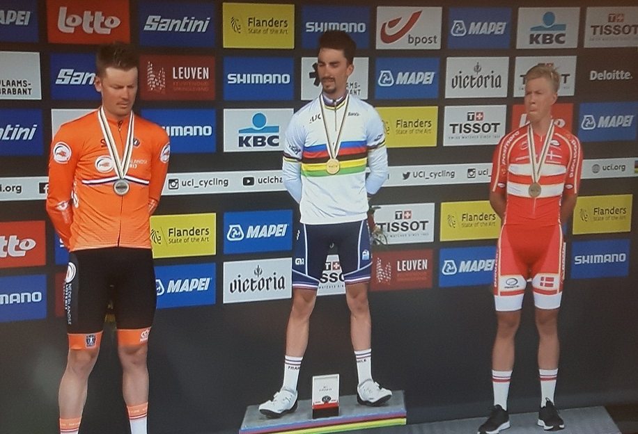 Nous reviendrons sur ces championnats du monde « FLANDERS ». Ajoutons juste présentement que le « CLM » n’était pas fait pour nos coursiers – avec des routes pareilles comment GANNA ne pouvait-il pas gagner ? – et que la ROUTE aurait pu être dessinée de meilleure manière. Il y a quinze jours, sur une image de MichelG, nous avions donné le vainqueur potentiel : ALAPHILIPPE. Le puncheur français remporte son second sacre de manière MERITEE. Quel coureur !!! Nous analyserons les comportements des nôtres dans les prochains jours. En attendant, c’est un coursier – non calculateur – mais avec énormément de « DECEUNINCK » dans les sélections (« SPORZA » en a fait la réflexion plusieurs fois) qui a fait la nique aux belges. Qui entre nous, étaient fortement divisés. Au bout du bout s’agit-il encore d’une épreuve entre équipes nationales ??? Là est la bonne question. Qui se pose à chaque championnat !!! FELICITATIONS A ALAPHILIPPE !!!