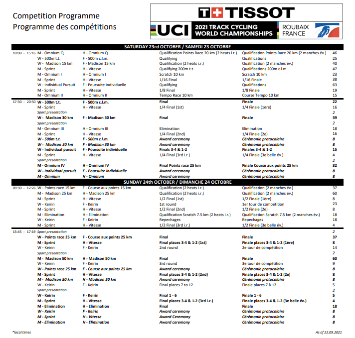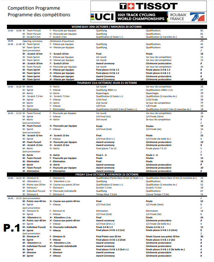 Les CHAMPIONNATS DU MONDE sur PISTE sont annoncés en FRANCE >>> ROUBAIX. Vélodrome STABLINSKI !!! Demandez le programme. Sur place, entre 12€ et 70€ suivant le jour et les prestations des coureurs (qualifications-finales). En tv sur « SPORZA ». D’autres chaines transmettent également : « EUROSPORT », … mais pas de « RTBF ».