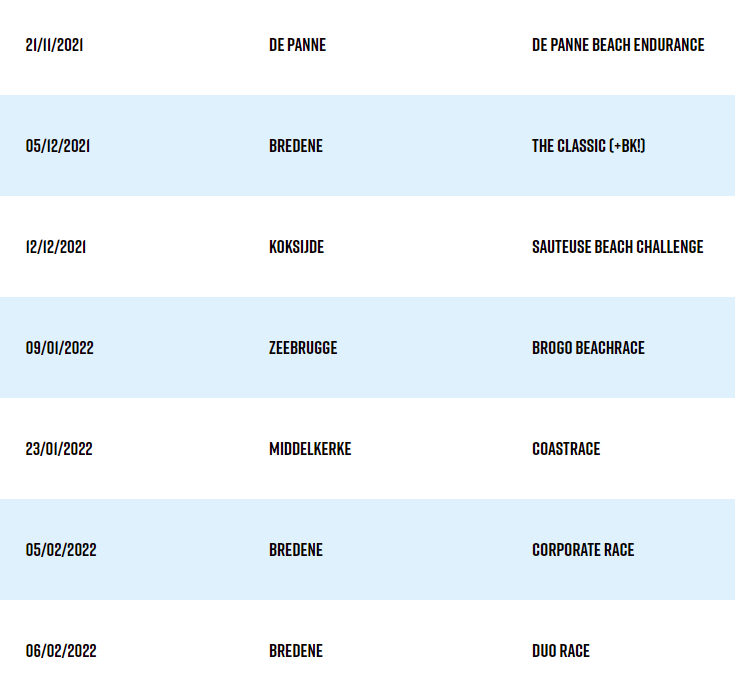 Cette année encore, les courses de plage seront nombreuses à la côte belge/aan zee. Voici le programme en entête. Plus sur le site des différentes épreuves. Ne vous y fiez pas car c’est excessivement dur. Par ailleurs, les pros et autres grosses pointures chez les amateurs sont de plus en plus présents sur ces compétitions. #PréparationHivernale – Bien sûr, il y a encore de purs amateurs mais ils deviennent rares. Nous serons sur deux ou trois d’entre elles.
