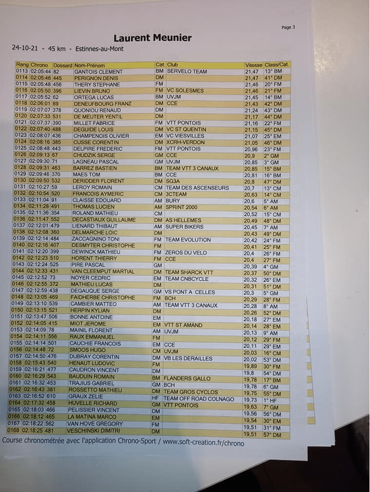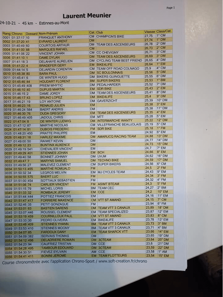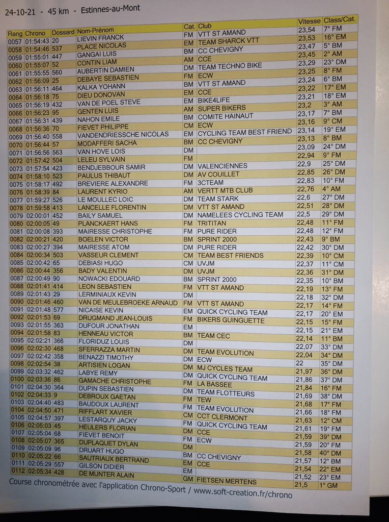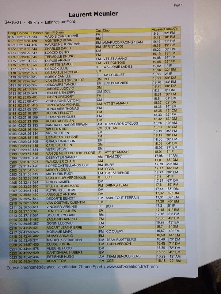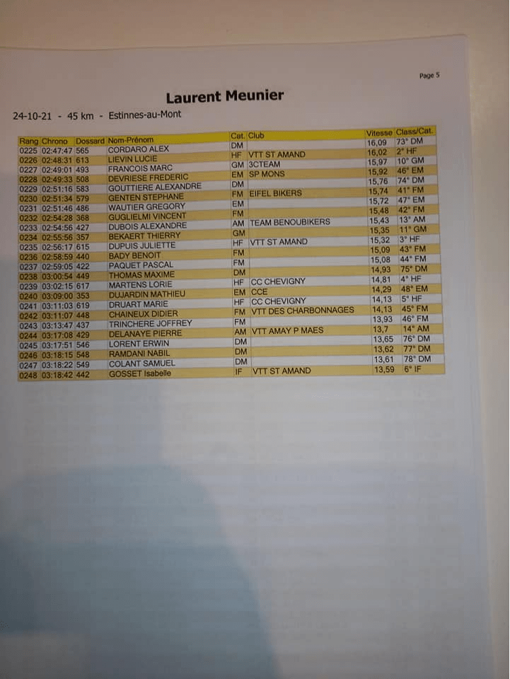 N’ayant pas encore toutes les informations utiles pour en faire un post, voici déjà les résultats qui proviennent de la page « FB » de la « LAURENT MEUNIER ». Les « officiels » ne les ayant pas encore publiés. Merci.