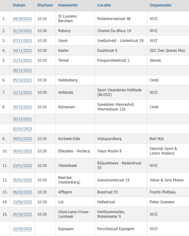 Le « VELO CLUB SPORT ET LOISIRS » de WODECQ fait partie du calendrier de la « WVZ » pour « WIELERVRIENDEN ZENNEVALLEI ». Une fédération qui existe depuis des lustres. Elle est même venue à Bois-de-Lessines dans les années 1990 et à Lessines dans les années 2000. Une seule course pour toutes les catégories (3) avec un départ matinal (10h30). Rendez-vous le 16/01/2022. Vtt ou vélos de cross acceptés !!!