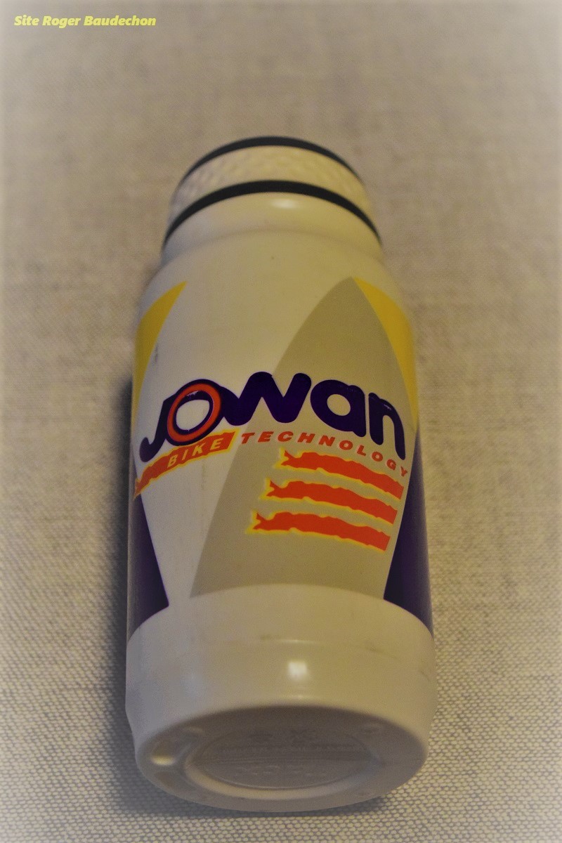 Photo. Un bidon « JOWAN ». Pas de la génération rouge et blanc. Mais de celle des bruns et des mauves suivant l’un ou l’autre club. Merci à Michel GRAVEZ pour ce bidon !!! Top.