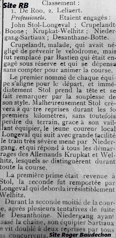 (Pour rappel) Ce vélodrome acrenois se trouvait derrière l’ancienne cure de la Rue Saint-Géréon. Face au château Roc DEPRES. Plusieurs textes du site font état des épreuves qui s’y sont déroulées par intermittence. Cet anneau a vu passer bon nombre de vedettes. Ainsi, dans cet article, vous pouvez lire les noms de : Jhon STOL. Ce hollandais a été plusieurs fois champion des Pays-Bas sur piste. Il a également remporté une kyrielle de « SIX JOURS ». En 1914, il était en fin de carrière. Une pointure qui avait été associée à l’acrenois Jules LONGEVAL. Un coursier qui avait du tempérament. Ensuite, vous avez le français Charles CRUPELANDT dont c’était la dernière saison. Il avait marché très fort par le passé. Vainqueur de « PARIS-ROUBAIX », d’étapes sur le « TDF », de « PARIS-TOURS », … . Il était associé à notre premier professionnel (individuel) lessinois. Emile BOONE est très certainement celui qui a lancé le sport cycliste dans notre ville. Il a participé à des classiques de renom. Dans le texte, apparait également l’allemand Franz KRUPKAT, un champion national associé à son compatriote WELHITZ. Vient ensuite la paire Florent DESANTHOINE-Paul SARTIAUX. DESANTHOINE était de Morlanwelz. Il débutait. Il étoffera son palmarès au fil des saisons. SARTIAUX a été 3e d’un « GP DE GRAMMONT ». La dernière paire était composée de Constant NIEDERGANG et de Camille BOTTE. Un gars de Roubaix et un autre de Braine-le-Comte qui ont participé à plusieurs « TDF » (2 et 8). Et dire que les spectateurs ont pu voir rouler de tels athlètes dans leur village. CRUPELANDT, le natif de Roubaix, a remporté deux fois la terrible classique. Depuis, il a un secteur pavé à l’entrée de l’ancien vélodrome.