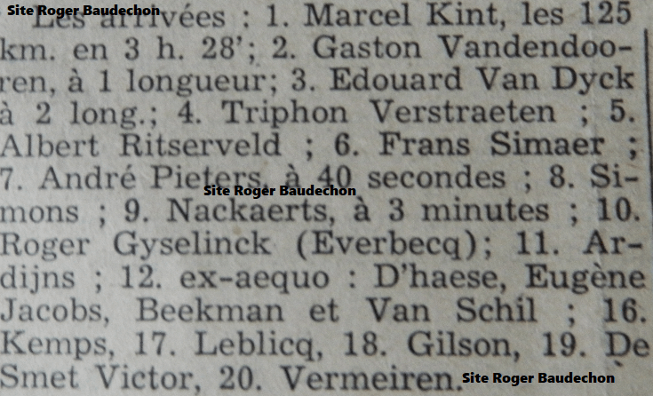 Marcel KINT, alias « L’AIGLE NOIR », a roulé à MESLIN L’EVEQUE (Ath). C’était en 1940. Si vous faites des recherches dans les différents sites contenant des archives, vous ne retrouverez pas cette épreuve. Ni même dans les brochures de l’époque. Un critérium auquel 43 concurrents avaient participé. Il y avait 60 tours d’un circuit de 2 km à parcourir. Ils sont quatre pour le sprint final. KINT saute VANDENDOOREN aux abords de la ligne. VAN DIJCK et VERSTRAETEN sont à quelques longueurs. Les commentaires du journaliste sont élogieux. La vedette internationale a été impériale, l’aigle porte bien son surnom.