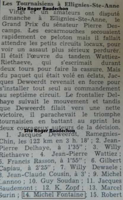 Comme tout le monde le sait, Patrick FONTAINE est natif de Tournai. Il a 57 ans. Issu d’une famille de coursiers, dont son papa, il n’a jamais eu de cesse d’enfourcher un vélo. Très connu lorsqu’il était dans le club de la « ROYALE PEDALE SAINT-MARTIN », il a fait parler la poudre chez les jeunes. Il faut avouer que les gars du Tournaisis avaient du répondant. D’ailleurs, ils ont connu plusieurs générations dorées. Patrick FONTAINE était un solide. Un dur au mal. Un peu un diesel. Un brave aussi. Peut-être un peu trop pour un milieu comme celui-là qui ne pardonne rien. Cela ne l’a pas empêché de rejoindre le rang des professionnels en 1985 avec : « ROTEN-SPIESSENS » et « PECAES-BOLATO-LANGROVER ». Il aura côtoyé : DAELMAN, DIERICKX, OMLOOP G, POPPE, RUDKIN, CHMIELEWSKI, PIATEK, WAJS, … . Chez les amateurs internationaux, il a gagné à WIERS, 1 étape du « TOUR DU HAINAUT » à Mouscron, 1 étape du « TOUR DE BELGIQUE », … . Nous nous souvenons très bien de son papa et de sa maman, des mordus. Jean DEBLOCK était un peu son mentor. Patrick FONTAINE n’a jamais vraiment stoppé le cyclisme. Par la suite, il est redescendu chez les amateurs. Il a été affilié dans divers clubs dont « CONDE SUR ESCAUT-PERUWELZ » chez les officiels. Il a continué sur sa lancée en restant très longtemps dans les pelotons de l’EDH. Pour sûr, il n’a pas tout abandonné !!! #Souvenons-nous