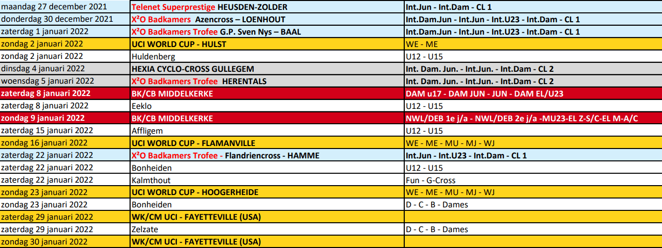 Un mois crucial se profile à l’horizon. « BELGIAN CYCLING » vient de réagir en demandant aux autorités de lever l’interdiction de public sur le cyclocross. Voici le tableau des prochaines semaines. Avec ou sans spectateurs, organisés ou pas, janvier risque bien d’être sous tension. De plus, avec un variant qui est annoncé très prolifique.