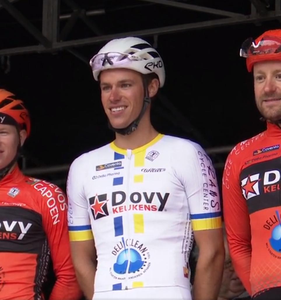 Je me sens très bien dans l’équipe « Dovy Keukens – FCC ». Pour moi c’est l’une des équipes la plus proche de chez moi, elle est notamment située à Roulers. En hiver il y a deux sorties collectives par week-end. Je peux m’y rendre à vélo et la route de retour me permet de rajouter quelques kilomètres à ma sortie. J’en profite le week-end car en semaine je ne peux pas faire d’entrainement d’endurance. Le samedi l’entraînement est plutôt corsé et le dimanche c’est plutôt cool. Je me sens très bien dans l’équipe une bonne bande de potes. Dans l’équipe on retrouve des coureurs de tout niveau avec chacun leur spécialité, un bon atout pour se rendre sur les interclubs. Nous avons des hommes très rapides et quelques bons rouleurs. Dès ma première saison je m’y suis senti le bienvenu dans un entourage familial. Nos équipements ressortent bien au sein du peloton ce qui est un avantage pour les supporters.