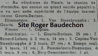 Ce ne sont pas les vélodromes qui manquaient dans notre région. Voici PIPAIX. Dans quelques jours ce sera au tour de POMMEROEUL. Vous avez déjà énormément d’anneaux sur ce site. Dont celui de MEVERGNIES qui a beaucoup reçu de la famille LELEUX. A PIPAIX, en ce jour de 1953, CAPIAU (il est sur site) gagne la VITESSE. Dans la course à l’américaine, vous retrouvez la paire POMMELAERE-DEGAUQUE à la 5e place. SAMYN (il est sur site) mais qui est seul, termine 4e. Prenons note que VAN STEENBRUGGE Calixte avait remporté l’éliminatoire. Il était natif de Ooike – mort à Renaix à l’âge de 64 ans. Non sans avoir été professionnel de 1954 à 1959. Il pratiquait toutes les disciplines.