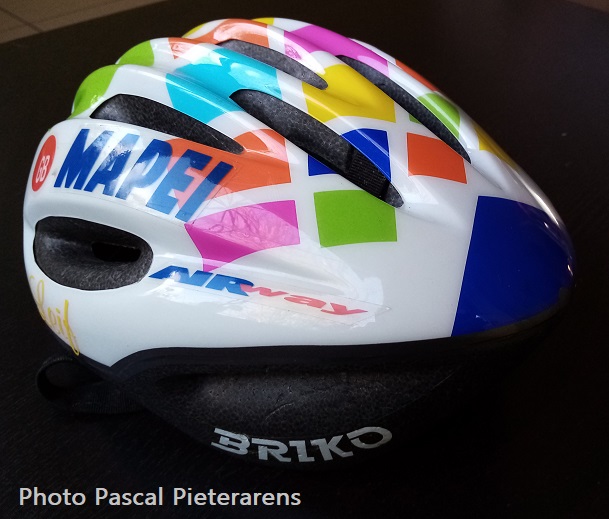 Un casque « MAPEI » qui a souffert presque autant que le coursier qui le portait. Après sa chute, l’accessoire est devenu obsolète ou presque. Mais c’est toujours un bel objet de collection. Le coureur, c’est Leif HOSTE. Par le passé, il avait aussi été renfort pour le « ROYAL PESANT CLUB LIEGEOIS ». Il avait roulé chez « ACCENT JOB ». Nous lui consacrerons un « SOUVENEZ-VOUS » prochainement. Vraiment une très belle pièce !!! Et puis, les rappels qui vont avec … .