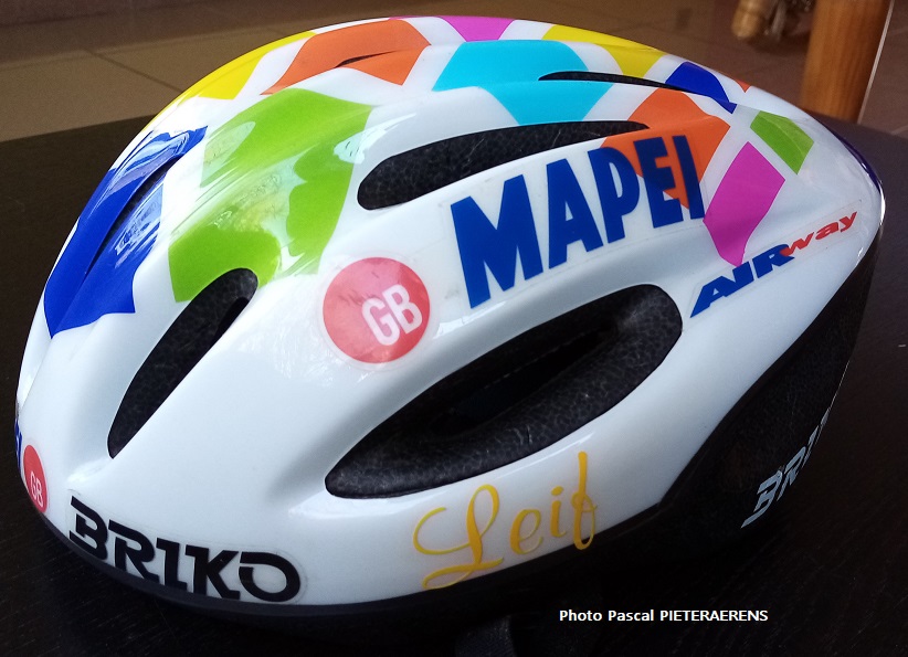 Un casque « MAPEI » qui a souffert presque autant que le coursier qui le portait. Après sa chute, l’accessoire est devenu obsolète ou presque. Mais c’est toujours un bel objet de collection. Le coureur, c’est Leif HOSTE. Par le passé, il avait aussi été renfort pour le « ROYAL PESANT CLUB LIEGEOIS ». Il avait roulé chez « ACCENT JOB ». Nous lui consacrerons un « SOUVENEZ-VOUS » prochainement. Vraiment une très belle pièce !!! Et puis, les rappels qui vont avec … .