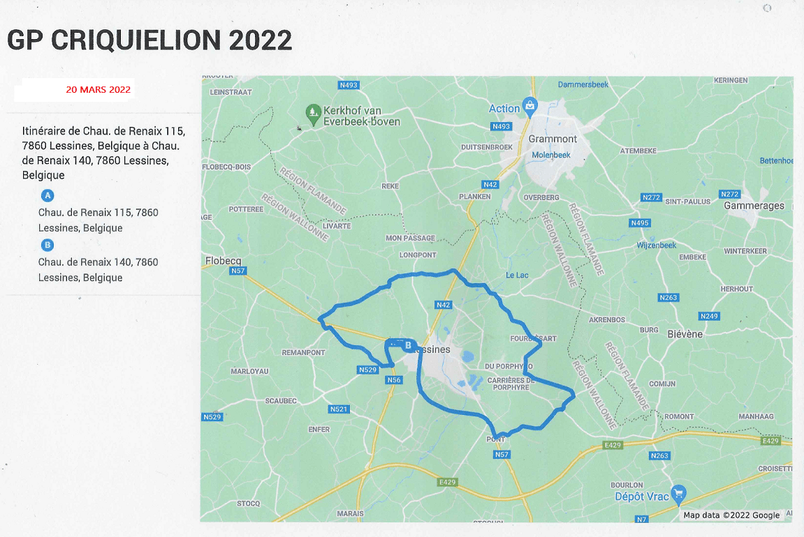 Le site web de l’ENTENTE CYCLISTE ACRENOISE a publié le nouveau circuit de l’épreuve de ce 20/03/2022. Un très beau parcours qui permettra à un coureur costaud de remporter le « GP CRIQUIELION » (côtes, pavés, différents gabarits de voiries, technique, … ). Mais également aux spectateurs de voir plusieurs passages des acteurs de cette journée attendue.