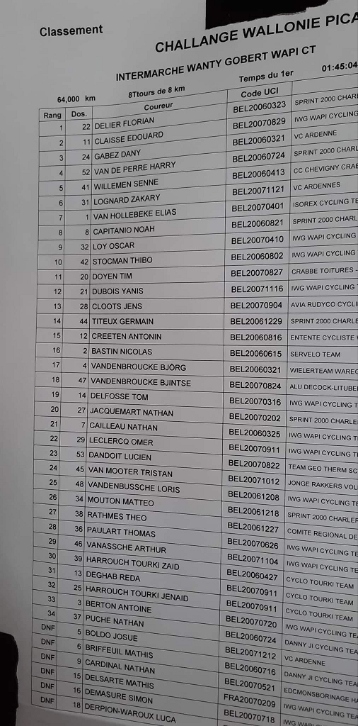 Ce second post pour présenter le podium et le classement qui nous ont été envoyés par HaroldD. Une épreuve rondement menée. 1 DELIER 2 CLAISSE 3 GABEZ. L’occasion de voir les nouvelles tenues en même temps que les coursiers.
